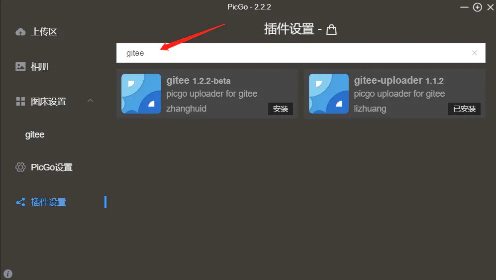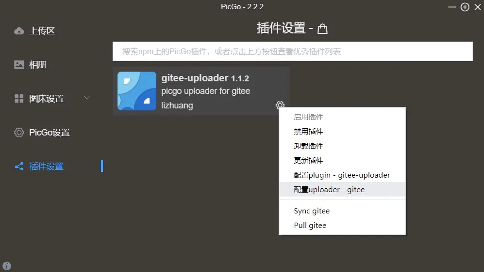 安装好之后退出搜索,点击已安装好的插件的右下角的齿轮图标进行配置。选择配置uploader-gitee。