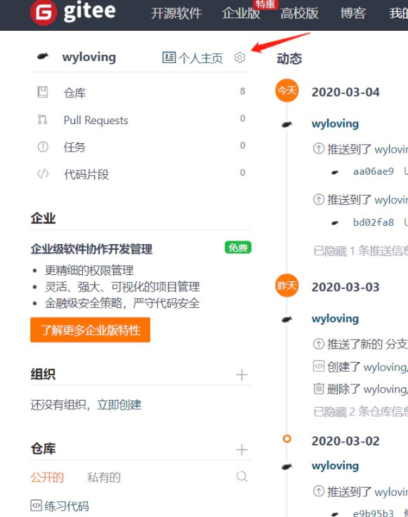 token则需要我们去码云上创建一个。打开码云,点击左侧个人主页旁的齿轮状设置图标。