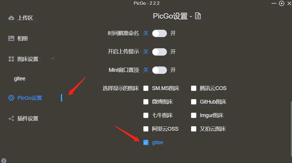 点击PicGo设置,往下拉,再选择显示的图床中勾选好gitee。