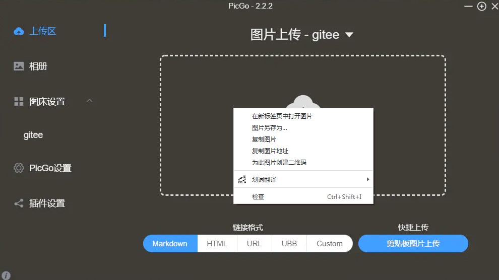 这样在上传区就能将图片上传至Gitee中获取外链了。
